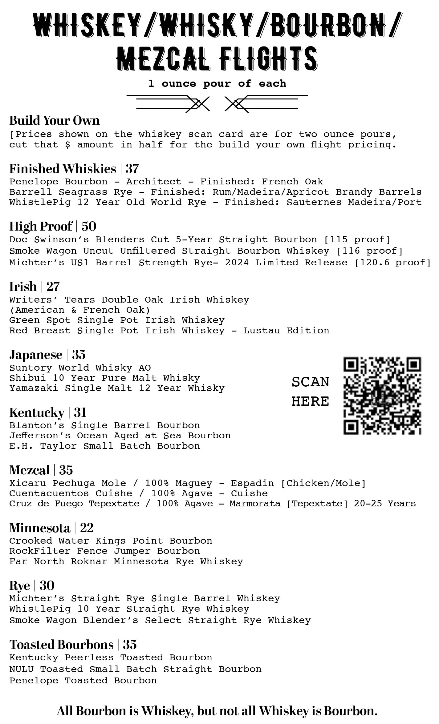 Build your own whiskey flights are 1 ounce pours and half the cost shown of a 2 ounce.
